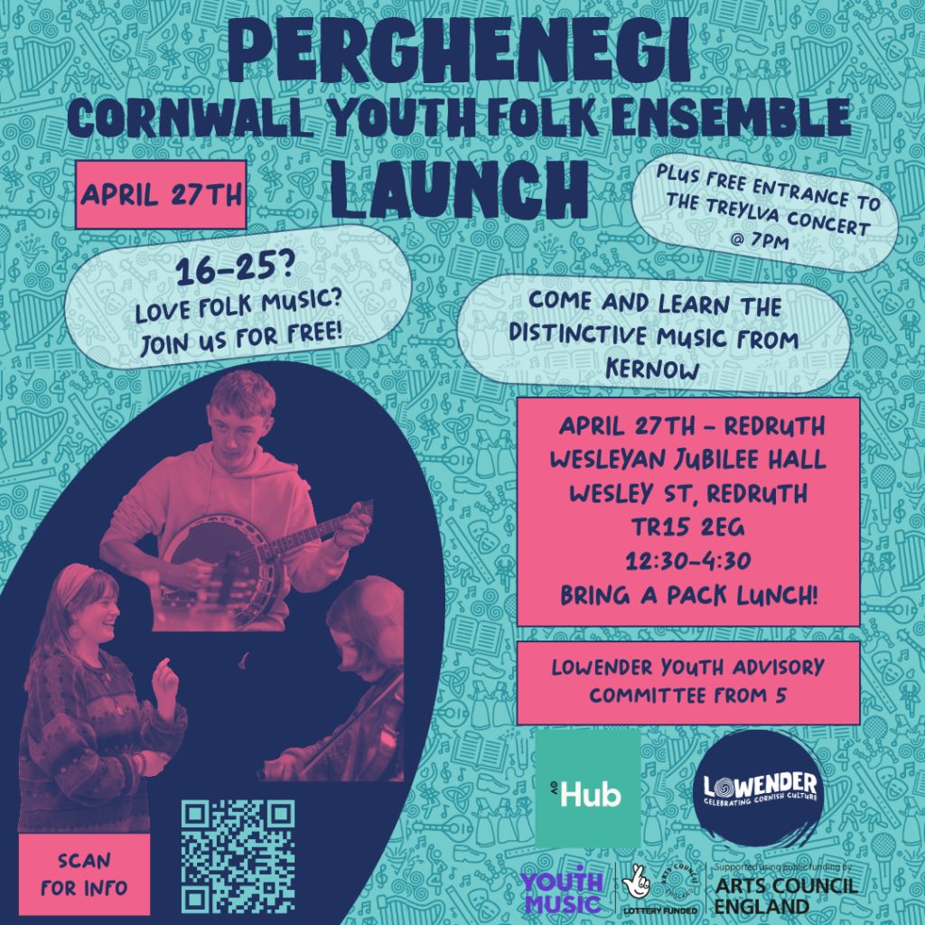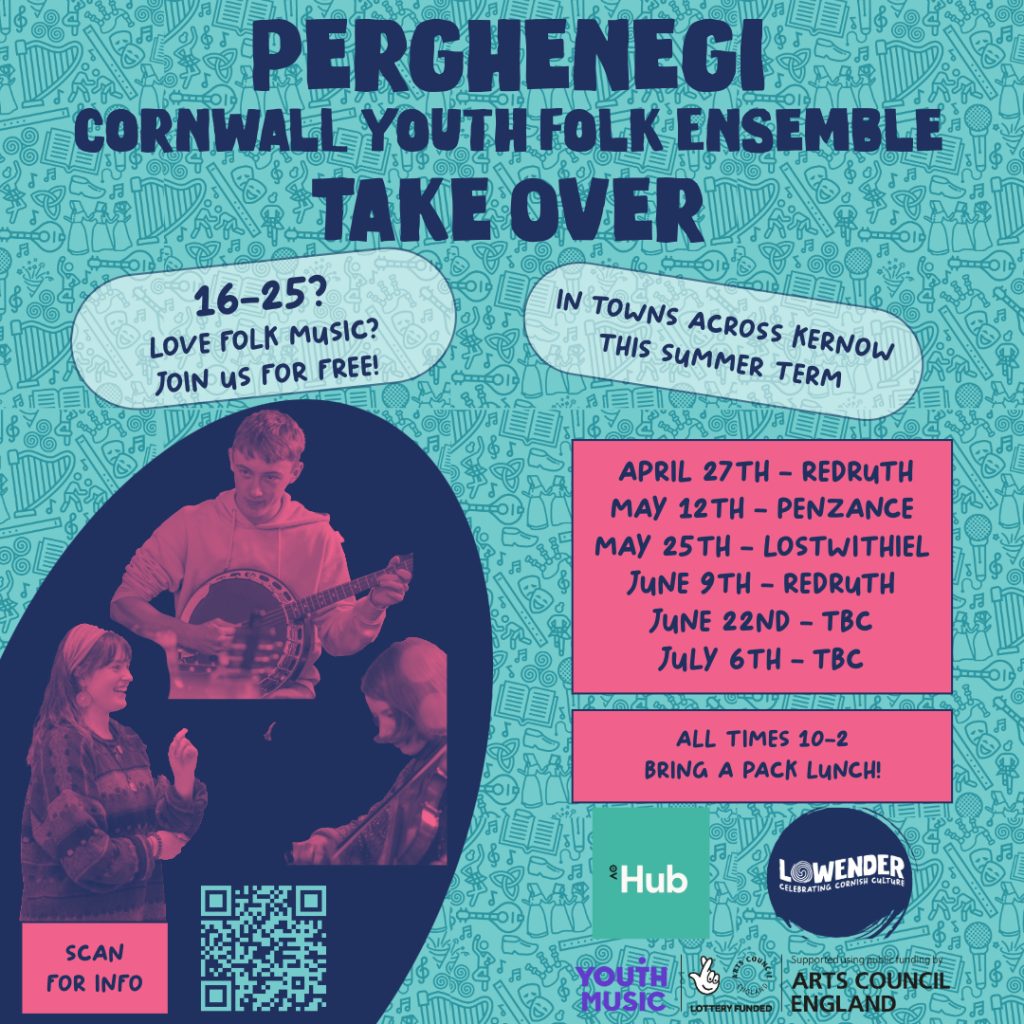 Sessions will be facilitated by Daniel Woodfield (a multi-instrumentalist, composer and musical director), with support from other professional musicians. Perghenegi means to ‘claim’ or ‘takeover’ in the Cornish language, so while the sessions are facilitated, the purpose of the Youth Folk Ensemble is that it is owned and led by young people.